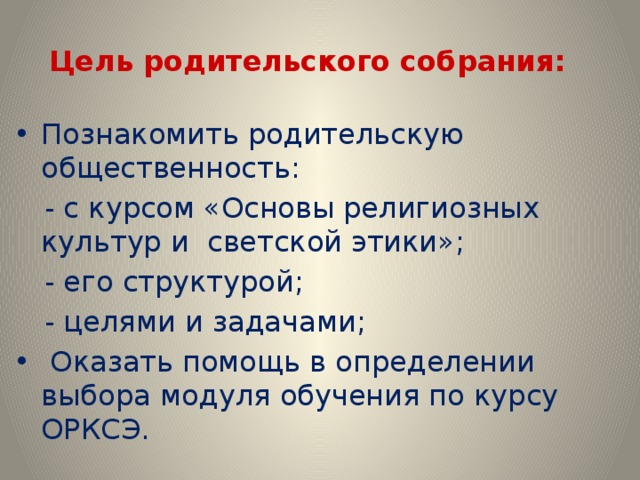 Преподавание направлено на воспитание учащихся, формирование их мировоззрения и нравственной культуры с учетом мировоззренческих и культурных особенностей и потребностей семьи школьника. В связи с этим выбор для изучения школьником основ определённой религиозной культуры или мировых религиозных культур, или основ светской этики согласно законодательству Российской Федерации осуществляется исключительно родителями (законными представителями) несовершеннолетнего учащегося.